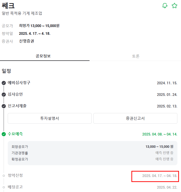 쎄크의 청약일정은 4월 17~18일이며, 대표 주관사는 신영증권입니다. 계좌 개설은 청약일 4영업일 전까지 완료해야 합니다.