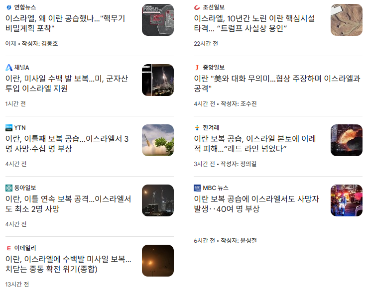 이스라엘이 이란 핵시설을 선제 공격하자 이란이 보복 공격으로 맞대응을 하며 두 국가 충돌이 이어지고 있다. 외신은 이란에서는 이스라엘 공격으로 78명이, 이스라엘에서는 이란 공격으로 3명