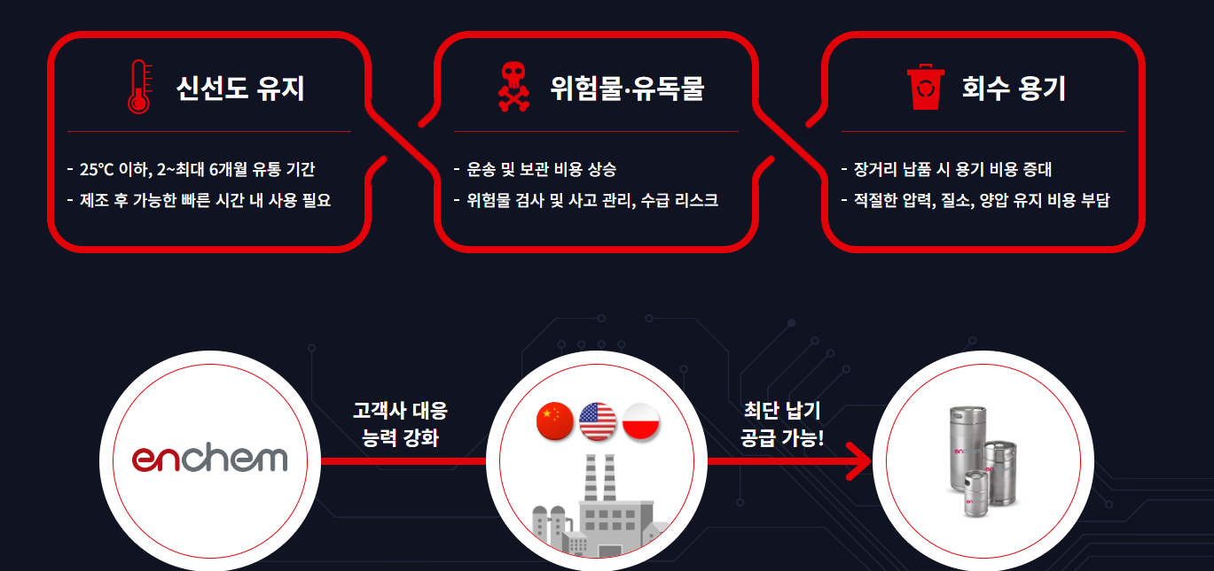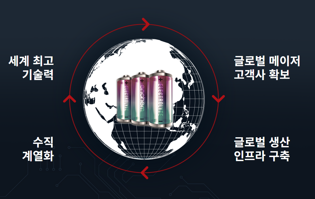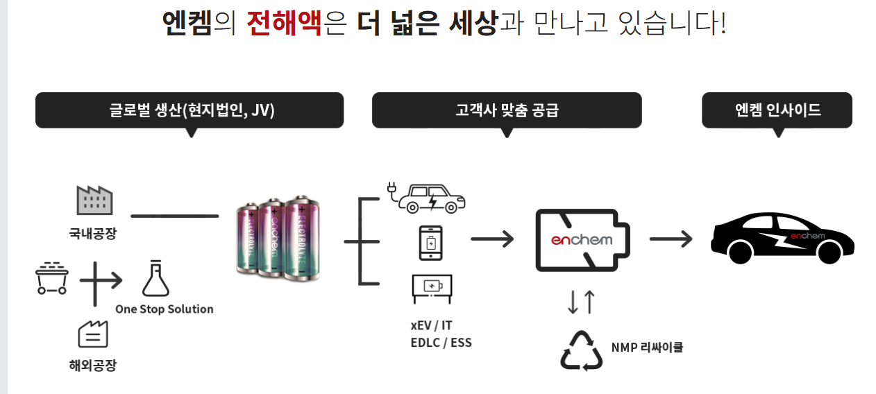 엔켐은 LG에너지솔루션, SK온, 삼성SDI 등에 전해액을 공급하는 기업으로, 국내 제천 본사 외에도 미국, 중국, 헝가리 등 주요 글로벌 거점에 생산기지를 보유하고 있습니다.