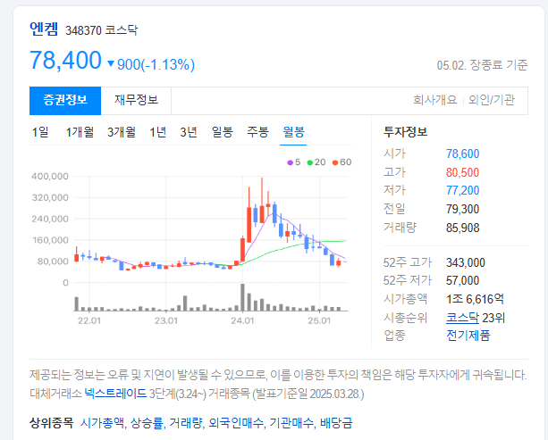 📌 엔켐 주가 실시간 확인 ▶ 네이버 증권 바로가기