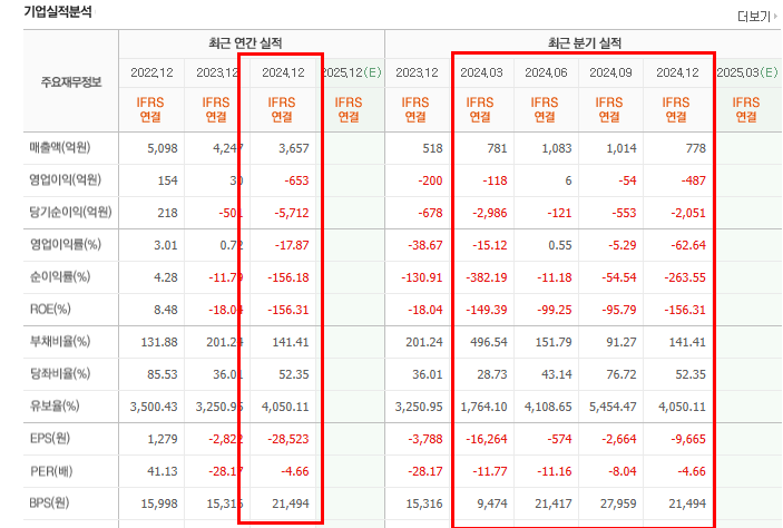 - 당기순손실: 약 3,653억 원 (전년 대비 1,032.5% 증가)