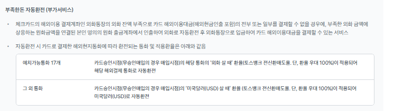 토스뱅크 체크카드를 외화통장에 연결하면 해외 결제 수수료가 완전 무료입니다. 국제브랜드수수료(1%)와 해외서비스수수료가 모두 면제됩니다.