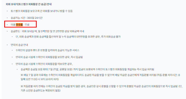 - 외화 송금은 토스뱅크 외화통장 보유자끼리만 가능하며, 타 은행으로는 송금이 불가능합니다