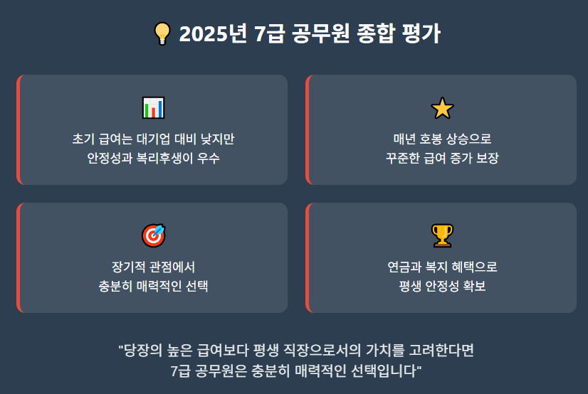 2025년 7급 공무원의 연봉 수준을 종합적으로 분석해본 결과, 초기 급여는 대기업 대비 낮지만 안정성과 복리후생 측면에서 상당한 메리트가 있다는 것이 제 결론입니다.