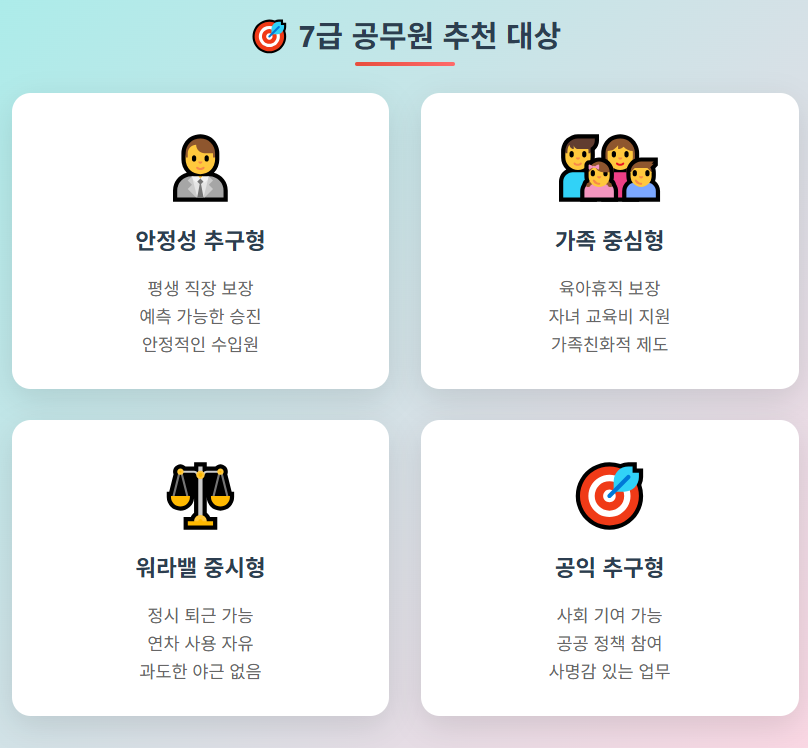 같은 30대로서 솔직히 말하면, 당장의 높은 급여보다는 평생 직장으로서의 가치를 고려한다면 7급 공무원도 충분히 매력적인 선택이라고 생각합니다. 특히 요즘처럼 경제적 불확실성이 큰 시기에는 안정성의 가치가 더욱 부각되고 있어요.