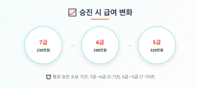 7급에서 6급으로 승진하게 되면 기본급이 약 10% 정도 인상되고, 직급보조비도 함께 올라갑니다. 보통 5-7년 정도면 6급 승진이 가능하니까 장기적인 급여 상승을 기대할 수 있어요.