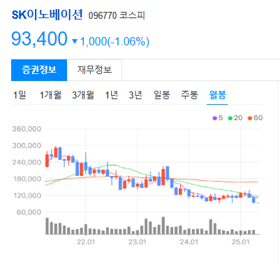 2025년 5월 기준 SK이노베이션 주가는 93,400원을 기록하며, 52주 최고가(139,200원) 대비 하락한 상태입니다.